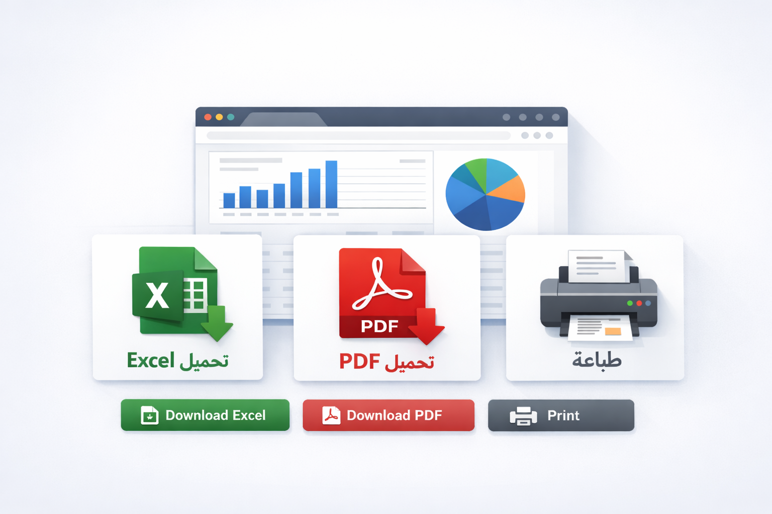 يمكنك نظامنا من إضافة وتنزيل البيانات بصيغة ملف الإكسل. ويمكنك أيضاً من تنزيل التقارير بصيغة PDF او يمكنك طباعتها.